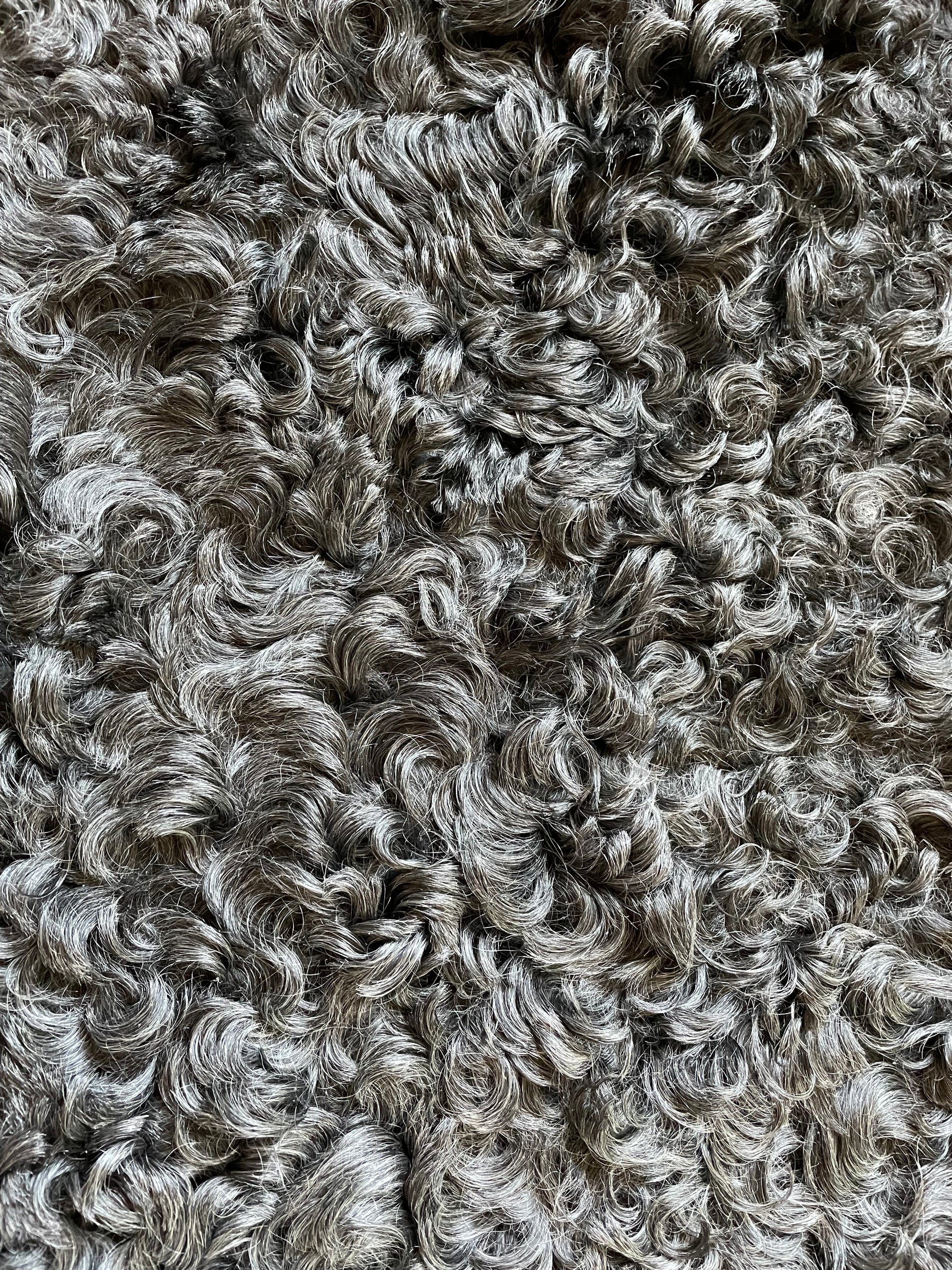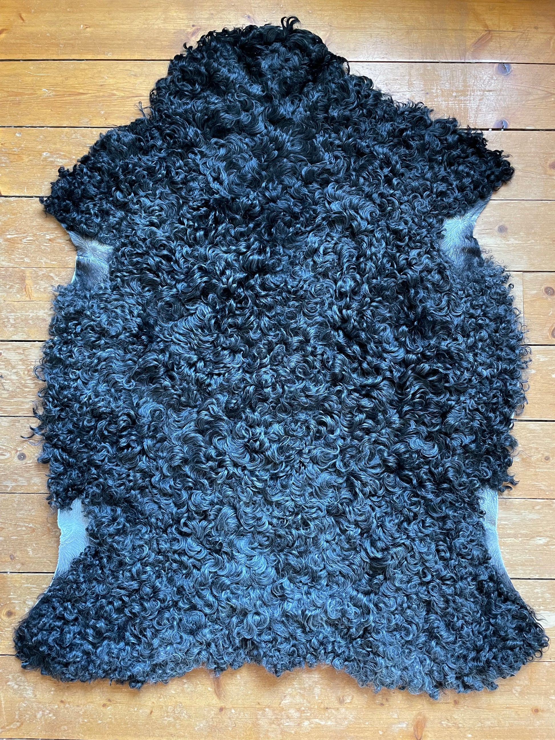 Svartgrått mycket glansigt lammskinn. Från fina Gotlandsfår med 45 mm lång stor lock. Från gården. Förädlat av Tranås Skinnberedning. Skinn av hög kvalité och med fin glans. Tvättbart i 30 grader med ullschampo. Unikt exemplar.